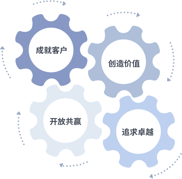 成就客户是一切决策的出发点,,,创造价值是衡量所有工作的标准,,,追求卓越是我们做事做人的态度,,,开放共赢是我们的格局也是最终的结果。。价值观的齿轮环环相扣,,推动着组织里的每个人不断向前。。。
