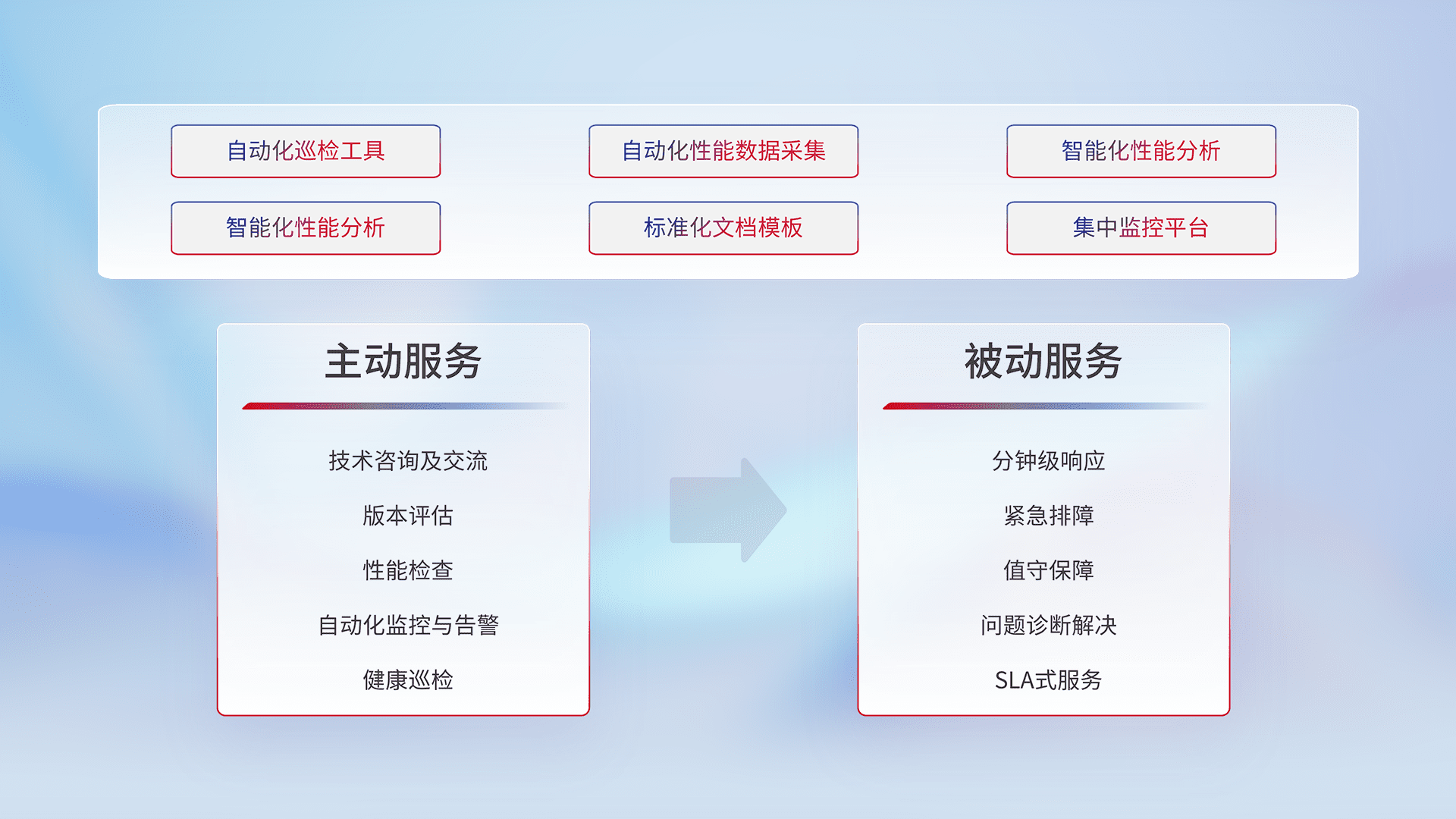 智能化工具和标准化文档,,,,保障服务质量,,,,提供主动服务(包含技术咨询、、版本评估、、性能检查、、、、自动化监控与告警、、健康巡检)和被动服务包含(分钟级响应、、、、紧急排障、、值守保障、、、、问题诊断解决、、、、SLA服务)。。。。