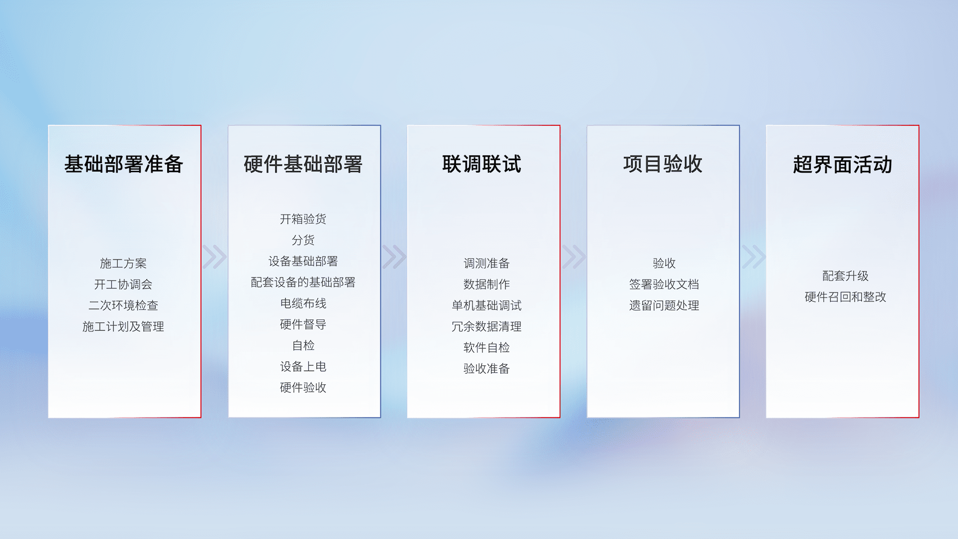 从基础部署准备、、硬件基础部署、、联调联试、、项目验收、、、越界面活动的全过程可追溯,,保证施工质量和进度。。