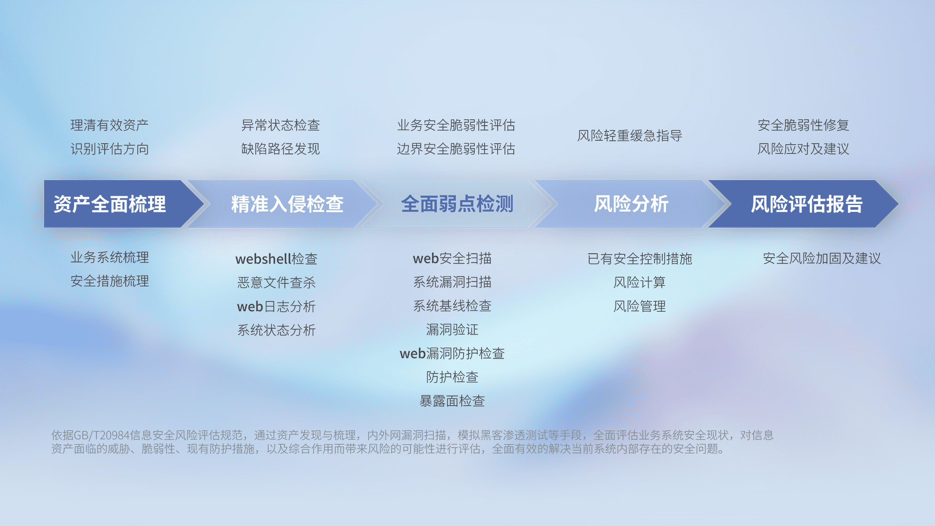 针对客户行业特性,,,,以专业的安全服务+多厂商联合解决方案提供专属的一站式安全管理服务,,,,帮助客户全面感知网络空间威胁,,,基于识别、、检测、、分析、、、防护、、、、监测、、、响应的服务理论模型,,,,从方案咨询、、、集成交付、、、评估验证、、、、优化加固、、、运维运营,,,致力于为客户提供完整的闭环管理式安全服务。。。以实战经验为客户打造高抵御风险的安全体系,,,,帮助客户发现威胁、、、对抗威胁、、、处置威胁,,,,不断积累安全对抗能力,,,,持续保障数字化安全。。。。